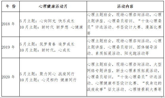 精准关心。实行“四五一”机制,即“五早”(早发现、早报告、早研制、早预防、早控制);“五对象”(贫困生、失意生、学习困难生、特殊家庭生、异常表现生);“五时段”(考试、假期、重大活动、失意、季节转换时);“五宁可”(宁可虚惊不可麻痹、宁可信其有不可信其无、宁可信其大不可信其小、宁可误报不可不报、宁可辛劳不可厌烦);“一机制”即“重点力量—组织落实—培训制度—汇报制度”,并开通了咨询热线,安排心理咨询老师值班。学校心理健康教育中心还为学生提供了心理健康测试与跟踪,举办了心理健康文化月、开展心理讲座等活动,“PA集团官网心理健康教育中心”微信号关注达6万人,心理普查和心理访谈率均达100%,多次获评“湖南省高校心理健康教育先进单位”。