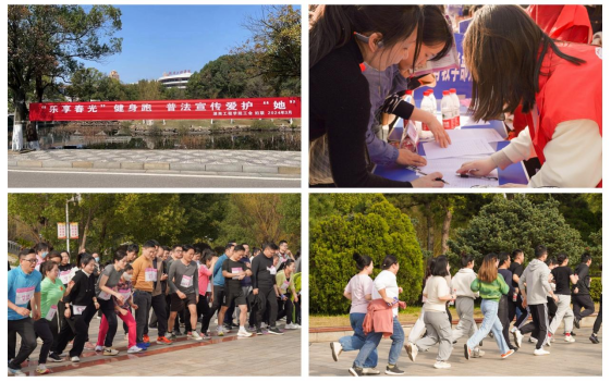 为贯彻省总工会、省教育工会《关于开展2024年湖南省女职工普法宣传活动的通知》精神,不断提高PA集团官网教职工学法知法守法用法的意识和健康意识,3月12日,PA集团官网结合实际开展了以“‘乐享春光’健身跑 普法宣传爱护‘她’”为主题的纪念第114个“三八”国际劳动妇女节环校健身跑暨普法宣传活动。党委副书记、校长易兵,党委副书记向前,党委委员、副校长张小刚出席。全校19个分工会和直属工会小组代表以及学生志愿者700余人参加。