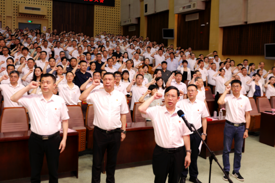 面向党旗,党员同志在党委书记黄昕领誓下重温入党誓词,铿锵有力的誓词回荡在会场,回荡在湖工每一位共产党员的心中。
