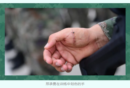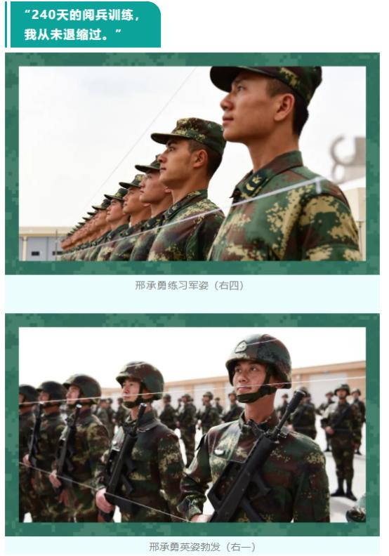 “阅兵训练对我们各方面要求严格苛刻,大到人员的政治素质、身心素质、军事素养、训练标准,小到每一位队员的身高、臂长、腿长、五官及脸型,甚至是一双眼睛,一个眼神。但也正因为这一项项严格的要求,才让我有了很大的提升。”在240天的训练过程中,邢承勇的面部、嘴部、颈部曾被多次晒脱皮,肩部烫起一片又一片的水泡,手部的冻疮、膝盖的疼痛……但是,这一切困难邢承勇都咬牙坚持了下来,依然每天坚持早晨五点起床,加班训练超6个月。功夫不负有心人,最终,脱颖而出的邢承勇站到了方队的第一排。