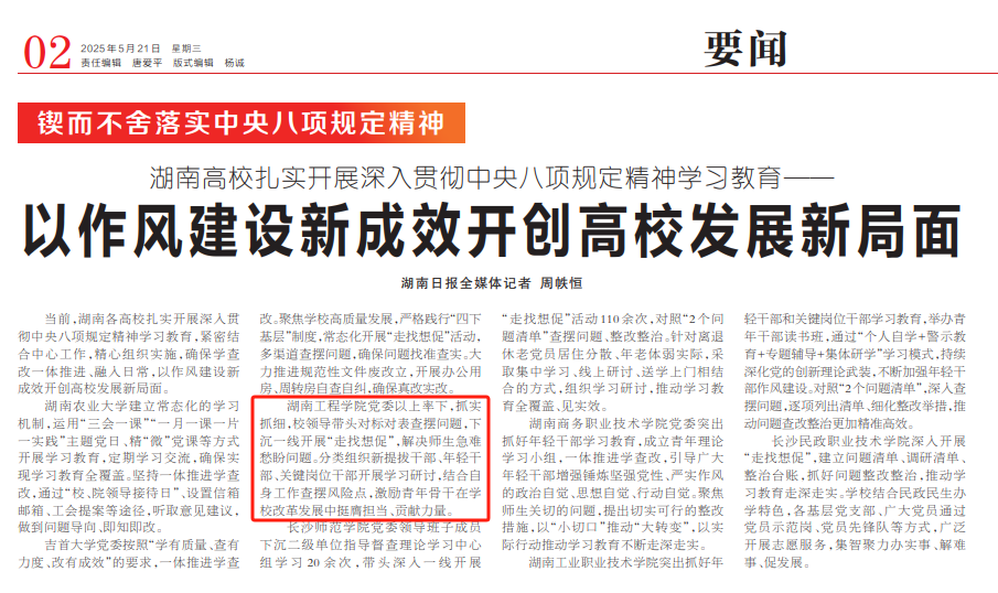 当前,湖南各高校扎实开展深入贯彻中央八项规定精神学习教育,紧密结合中心工作,精心组织实施,确保学查改一体推进、融入日常,以作风建设新成效开创高校发展新局面。
