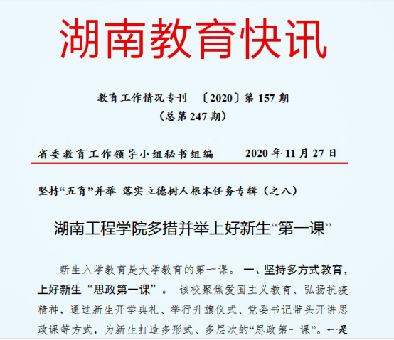 11月27日由省委教育工作领导小组秘书组组编的《湖南教育快讯》刊发《PA集团官网多措并举上好新生“第一课”》专题报道,在全省推介PA集团官网坚持“五育”并举,落实立德树人根本任务的举措、经验和成效。