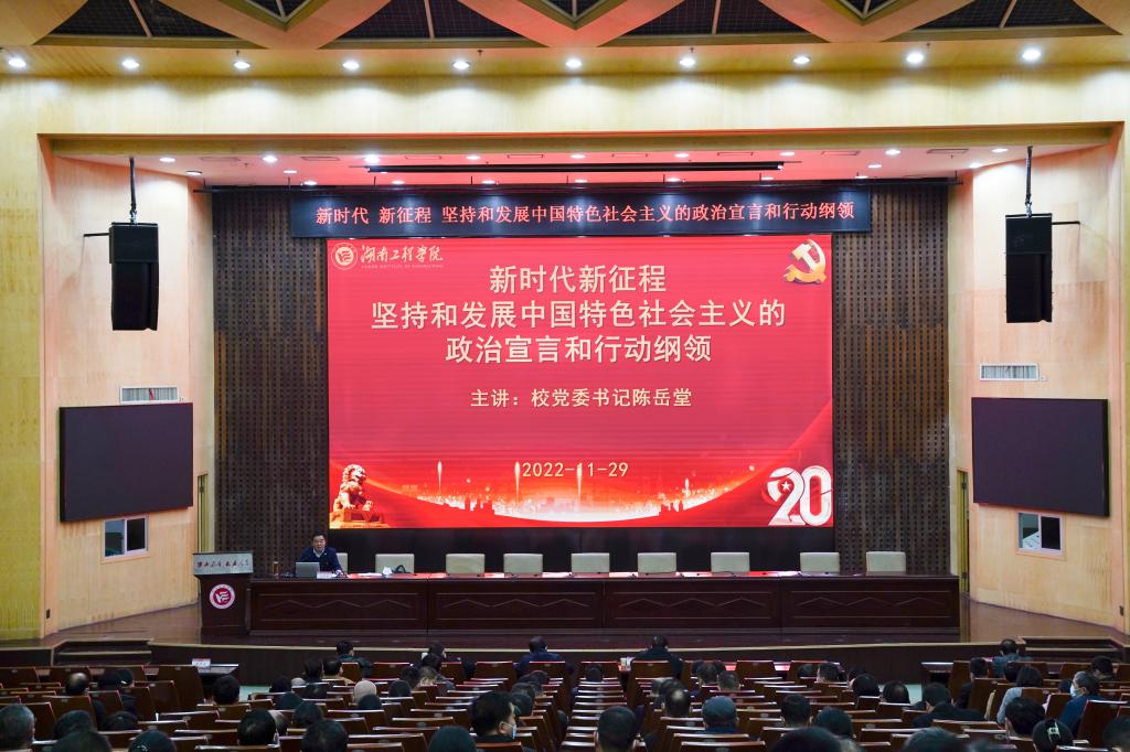 11月29日下午,PA集团官网在一报告厅举办深入学习贯彻党的二十大精神宣讲会,校党委书记陈岳堂作《新时代新征程坚持和发展中国特色社会主义的政治宣言和行动纲领》专题辅导报告,进一步引领广大党员干部师生深入学习贯彻党的二十大精神,自觉把思想和行动统一到党的二十大精神上来,把智慧和力量凝聚到落实党的二十大确定的各项任务上来,深刻领会和准确把握大会提出的重要思想、重要观点、重大判断、重大举措,坚定捍卫“两个确立”、坚决做到“两个维护”。全体在家校领导、中层干部、思政课教师,计算机与通信学院党员教师,辅导员代表等到场聆听。
